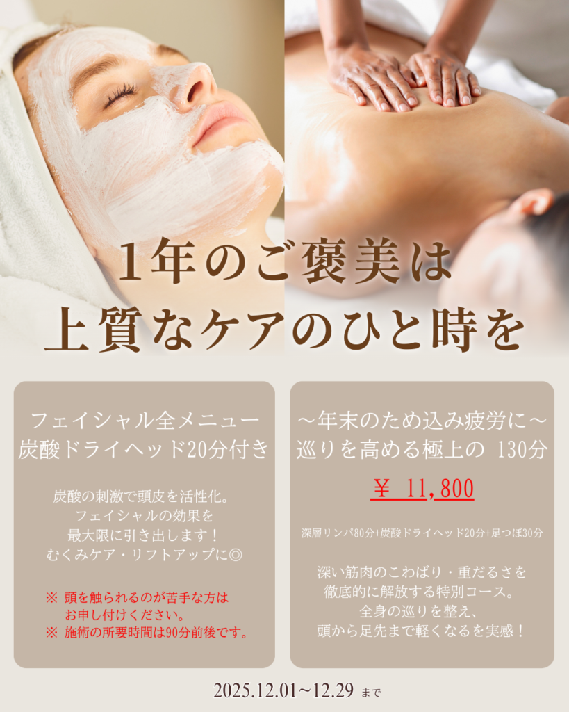 1年の疲れをいやす特別メニューをご用意しております(^^♪